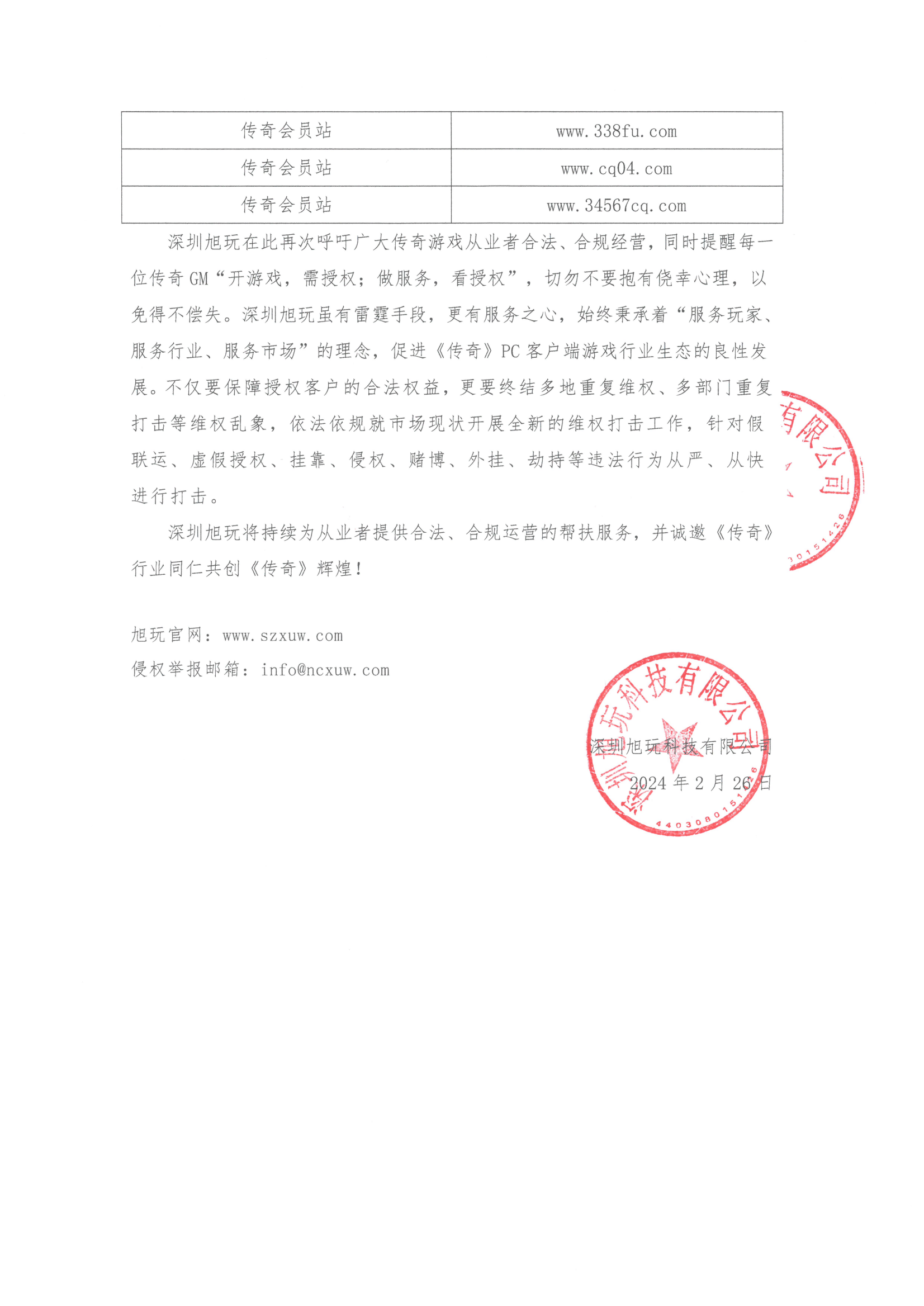 深圳旭玩科技有限公司(以下簡稱“深圳旭玩”)于2023年4月28日依據相關轉授權文件獲得了原始著作權人韓國亞拓士軟件有限公司針對《Legend of Mir II》(中文名:《傳奇》)網絡游戲PC端維權的獨占性權利,以及基于維權目的開發、運營《傳奇》作品PC端非官方版本并進行轉授權、分授權的權利。自獲得授權以來,深圳旭玩積極打擊違法侵權行為,凈化網絡環境,大力推動《傳奇》游戲的合法授權制度,依法維護《傳奇》著作權人的合法權益。