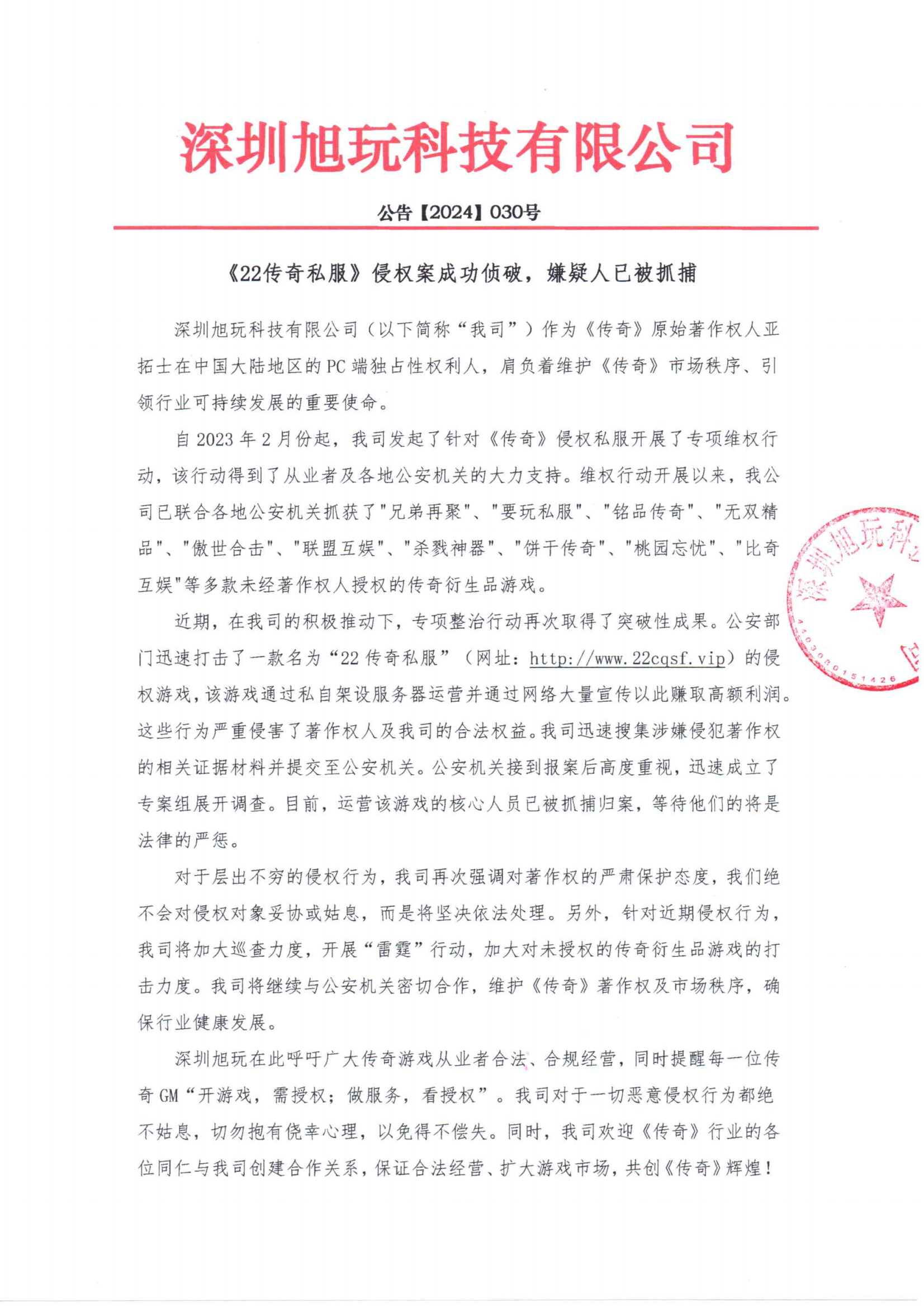 對于層出不窮的侵權行為,我司再次強調對著作權的嚴肅保護態度,我們絕不會對侵權對象妥協或姑息,而是將堅決依法處理。另外,針對近期侵權行為,我司將加大巡查力度,開展“雷霆”行動,加大對未授權的傳奇衍生品游戲的打擊力度。我司將繼續與公安機關密切合作,維護《傳奇》著作權及市場秩序,確保行業健康發展。
