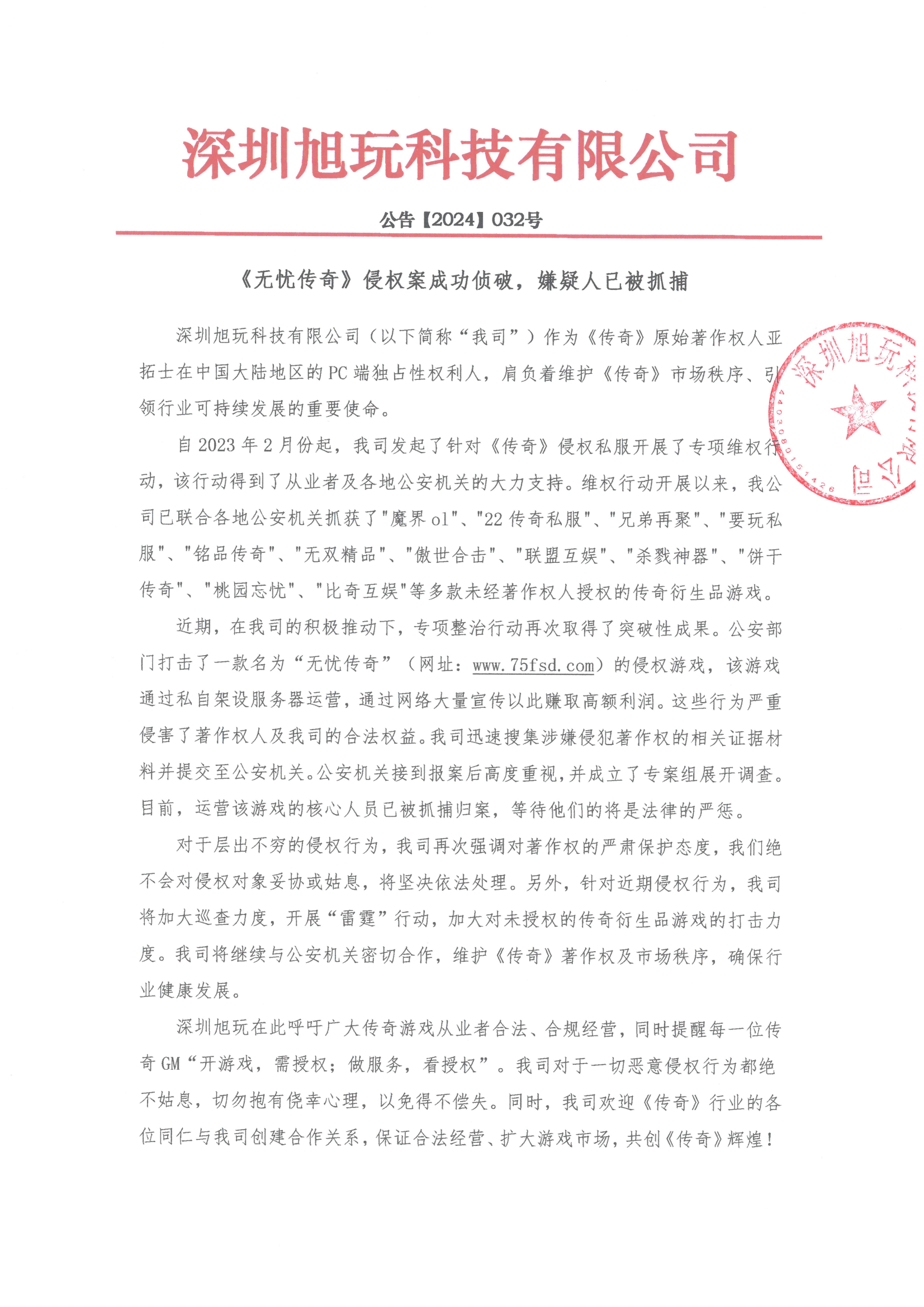 深圳旭玩在此呼吁廣大傳奇游戲從業者合法、合規經營,同時提醒每一位傳奇GM“開游戲,需授權;做服務,看授權”。我司對于一切惡意侵權行為都絕不姑息,切勿抱有僥幸心理,以免得不償失。同時,我司歡迎《傳奇》行業的各位同仁與我司創建合作關系,保證合法經營、擴大游戲市場,共創《傳奇》輝煌!