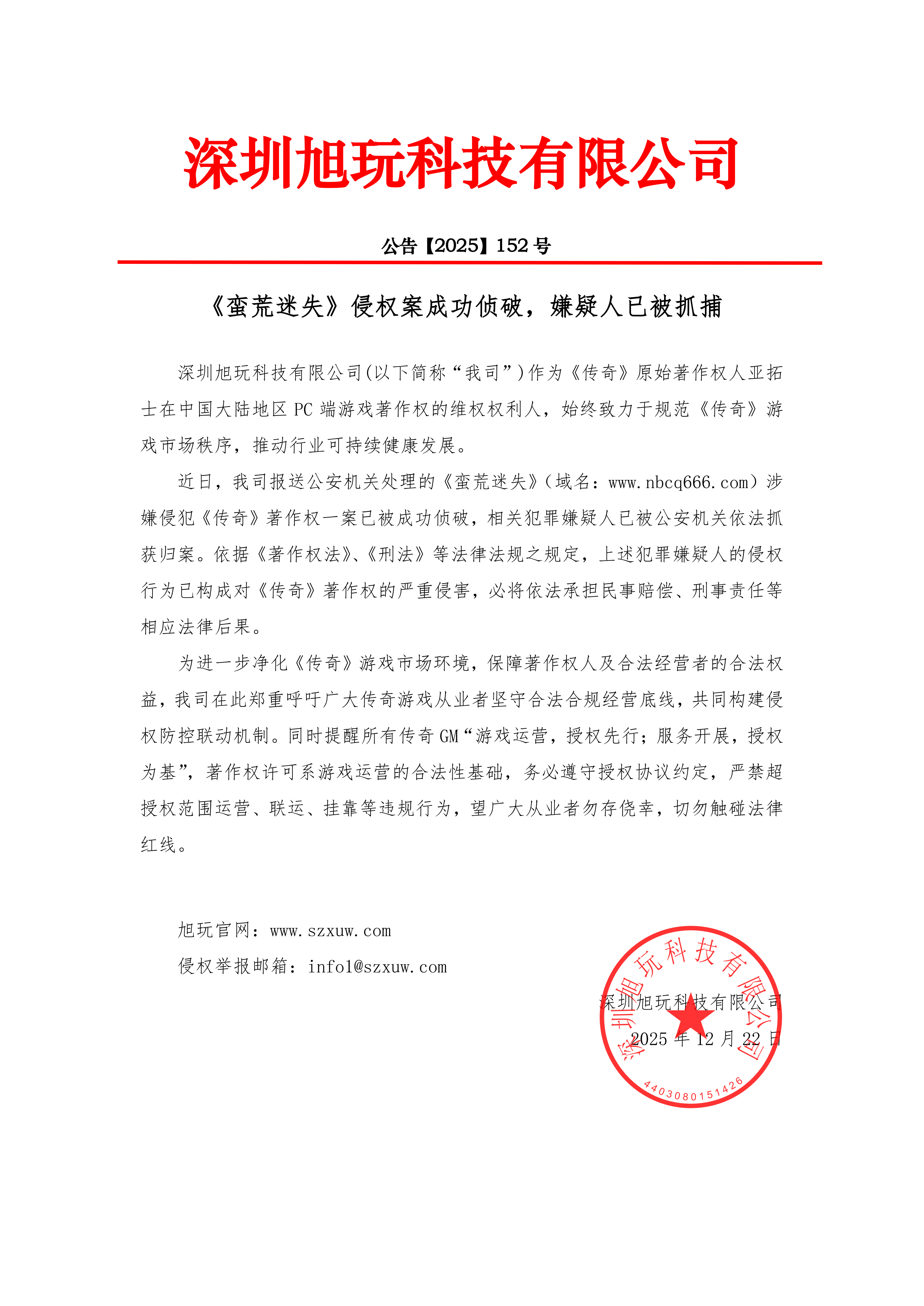 深圳旭玩科技有限公司(以下簡稱“我司”)作為《傳奇》原始著作權人亞拓士在中國大陸地區PC端游戲著作權的維權權利人,始終致力于規范《傳奇》游戲市場秩序,推動行業可持續健康發展。