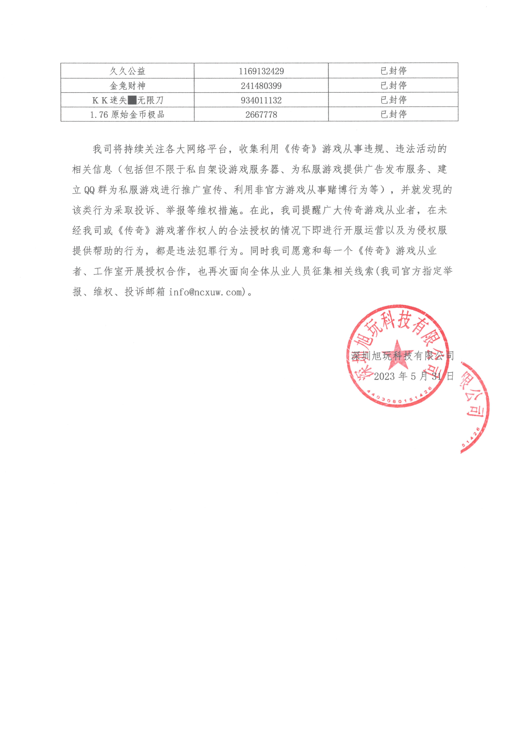 深圳旭玩科技有限公司(以下簡稱“我司”)于2023年4月28日起獨占性地獲得了針對《傳奇》PC端網絡游戲維權的權利,以及基于維權目的的開發、運營《傳奇》PC端非官方版本并收取合法化費用的權利。自獲得授權以來,我司積極打擊違法侵權行為,凈化網絡環境,大力推動《傳奇》游戲的合法授權制度,依法維護《傳奇》著作權人的合法權益。