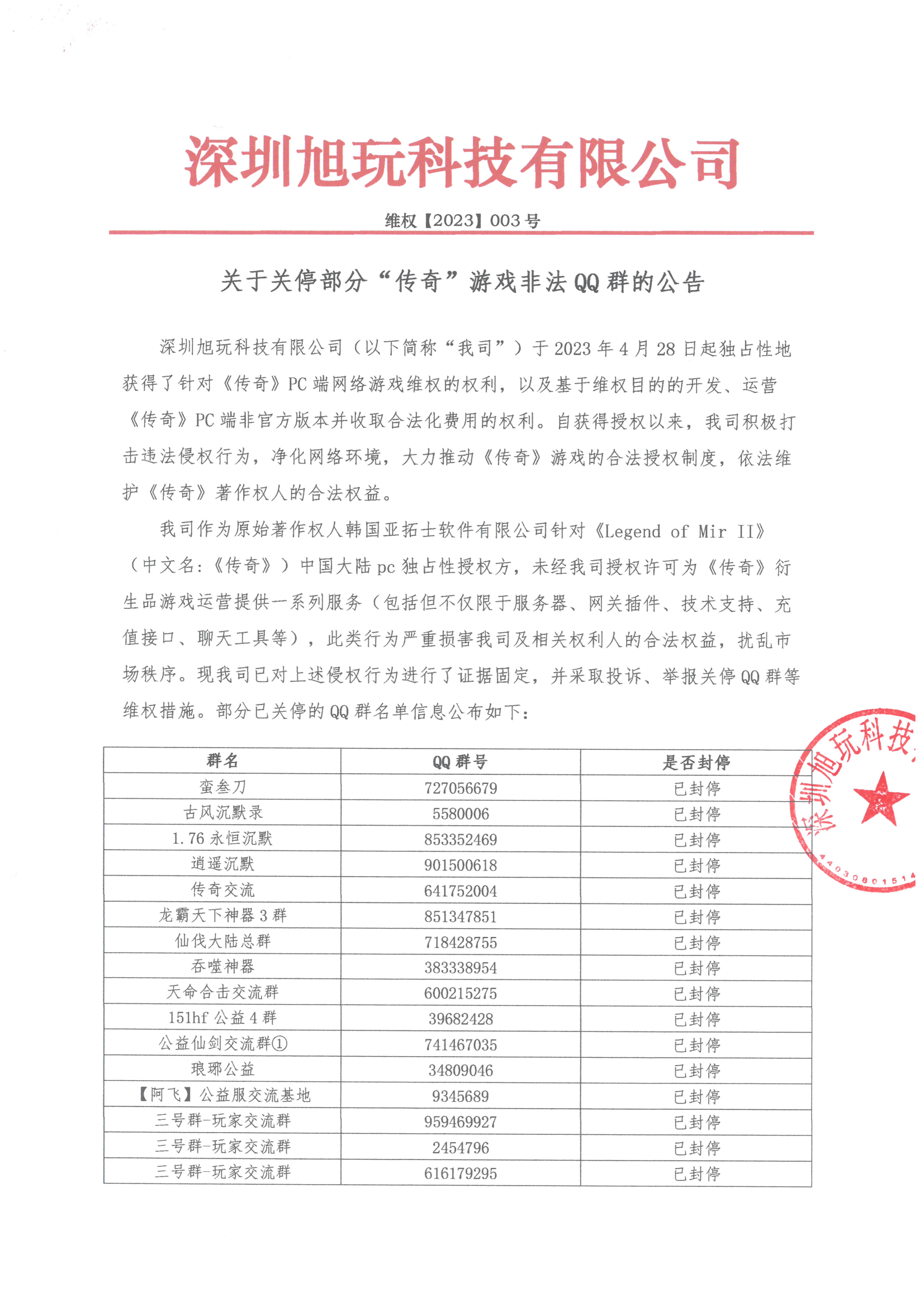 深圳旭玩科技有限公司(以下簡稱“我司”)于2023年4月28日起獨占性地獲得了針對《傳奇》PC端網絡游戲維權的權利,以及基于維權目的的開發、運營《傳奇》PC端非官方版本并收取合法化費用的權利。自獲得授權以來,我司積極打擊違法侵權行為,凈化網絡環境,大力推動《傳奇》游戲的合法授權制度,依法維護《傳奇》著作權人的合法權益。