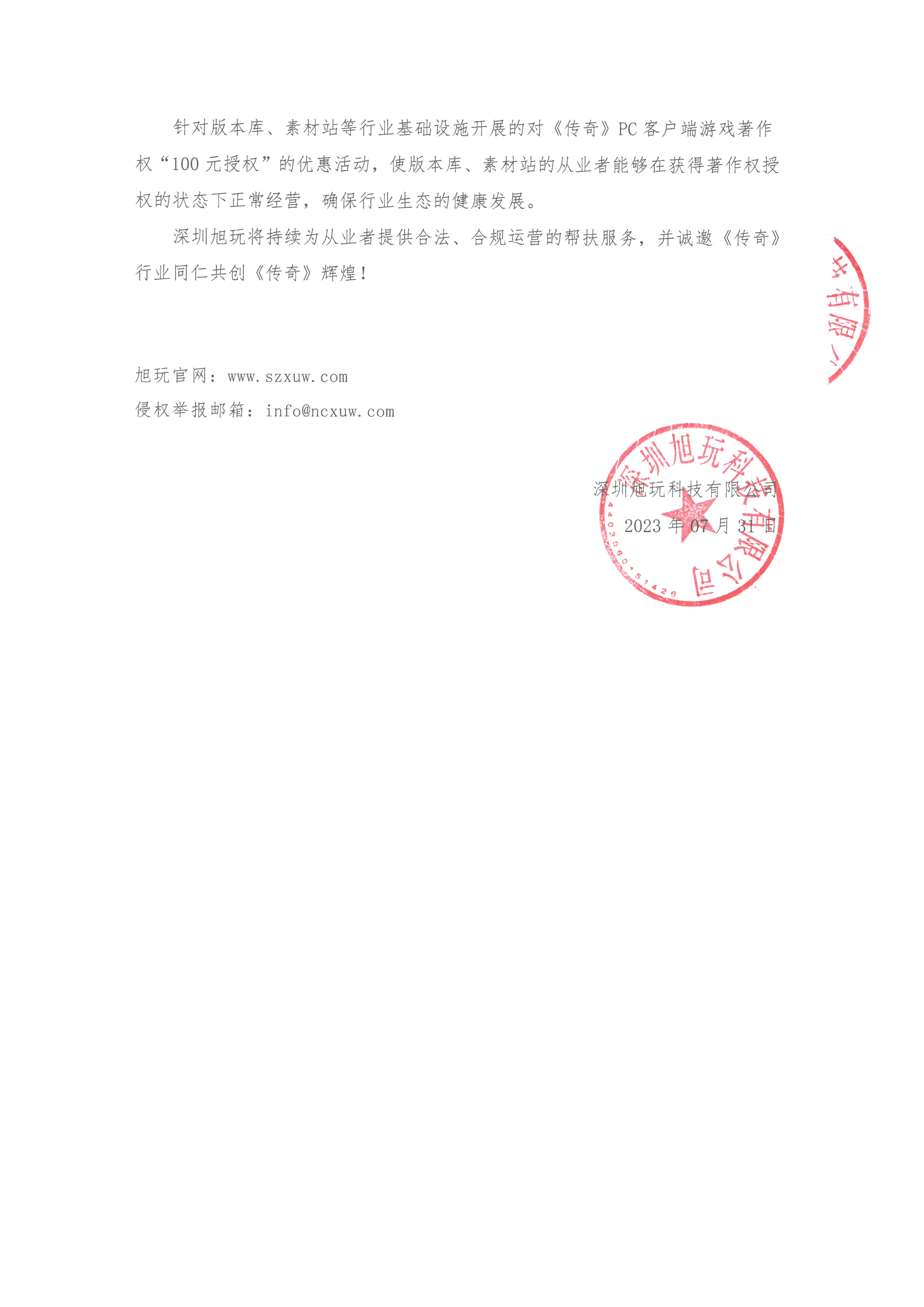 針對版本庫、素材站等行業(yè)基礎(chǔ)設(shè)施開展的對《傳奇》PC客戶端游戲著作權(quán)“100元授權(quán)”的優(yōu)惠活動,使版本庫、素材站的從業(yè)者能夠在獲得著作權(quán)授權(quán)的狀態(tài)下正常經(jīng)營,確保行業(yè)生態(tài)的健康發(fā)展。 深圳旭玩將持續(xù)為從業(yè)者提供合法、合規(guī)運營的幫扶服務(wù),并誠邀《傳奇》行業(yè)同仁共創(chuàng)《傳奇》輝煌!