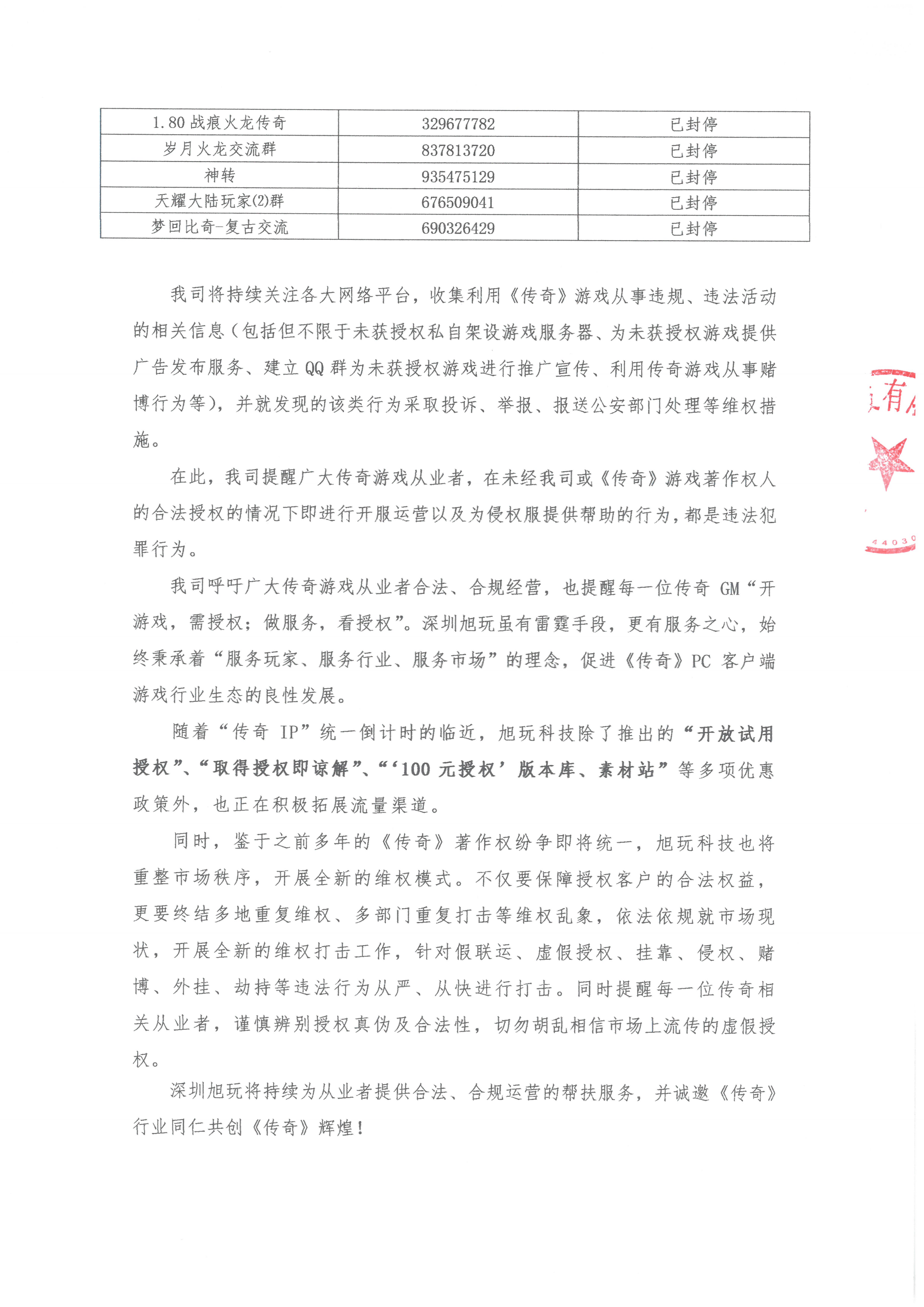 我司作為原始著作權(quán)人韓國亞拓士軟件有限公司針對(duì)《Legend of Mir II》(中文名:《傳奇》)中國大陸pc獨(dú)占性授權(quán)方,未經(jīng)我司授權(quán)許可為《傳奇》衍生品游戲運(yùn)營提供一系列服務(wù)(包括但不僅限于服務(wù)器、網(wǎng)關(guān)插件、技術(shù)支持、充值接口、聊天工具等),此類行為嚴(yán)重?fù)p害我司及相關(guān)權(quán)利人的合法權(quán)益,擾亂市場(chǎng)秩序。現(xiàn)我司已對(duì)上述侵權(quán)行為進(jìn)行了證據(jù)固定,并采取投訴、舉報(bào)關(guān)停QQ群等維權(quán)措施。部分已關(guān)停的QQ群名單信息公布如下: