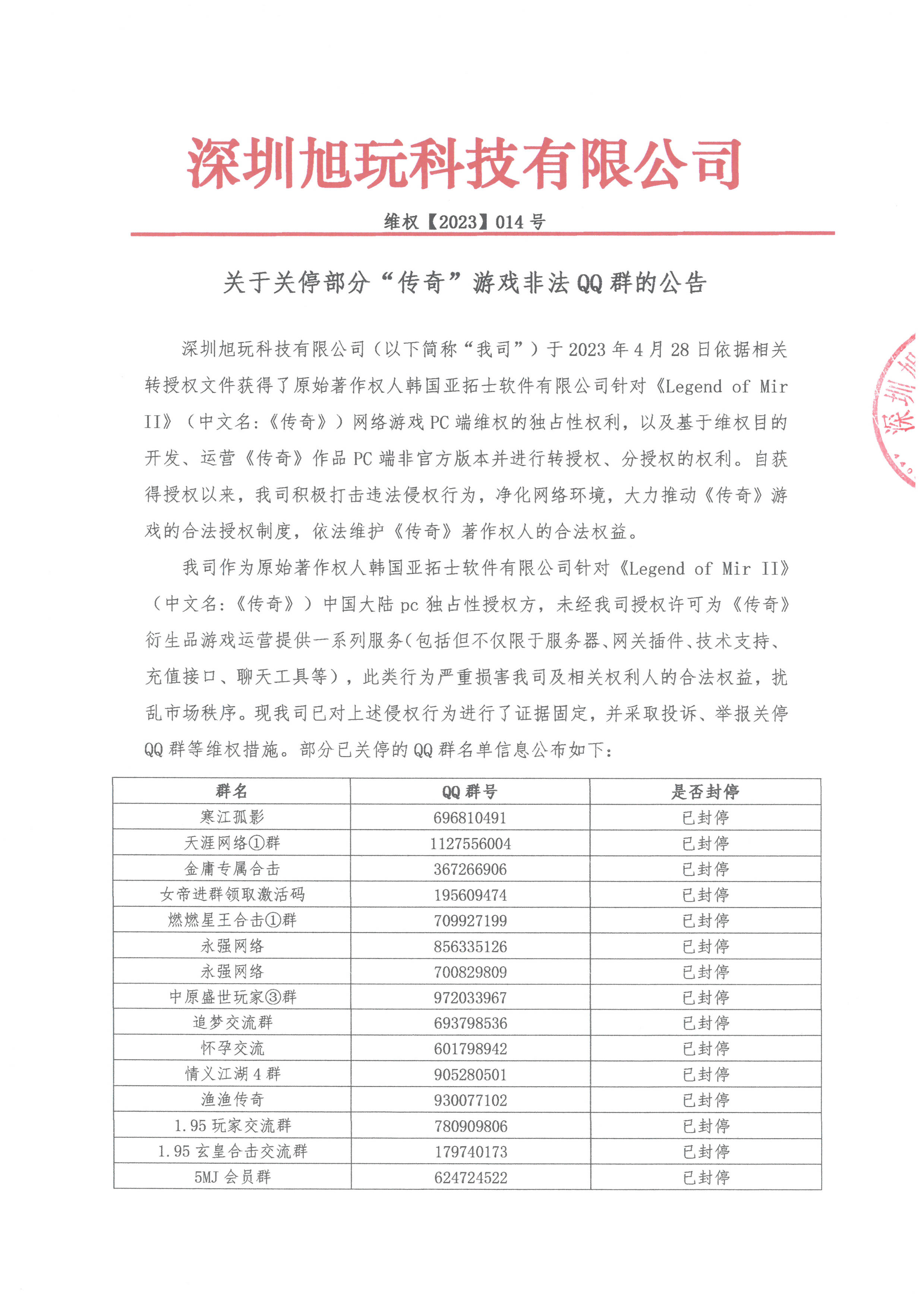 我司作為原始著作權人韓國亞拓士軟件有限公司針對《Legend of Mir II》(中文名:《傳奇》)中國大陸pc獨占性授權方,未經我司授權許可為《傳奇》衍生品游戲運營提供一系列服務(包括但不僅限于服務器、網關插件、技術支持、充值接口、聊天工具等),此類行為嚴重損害我司及相關權利人的合法權益,擾亂市場秩序?,F我司已對上述侵權行為進行了證據固定,并采取投訴、舉報關停QQ群等維權措施。部分已關停的QQ群名單信息公布如下: