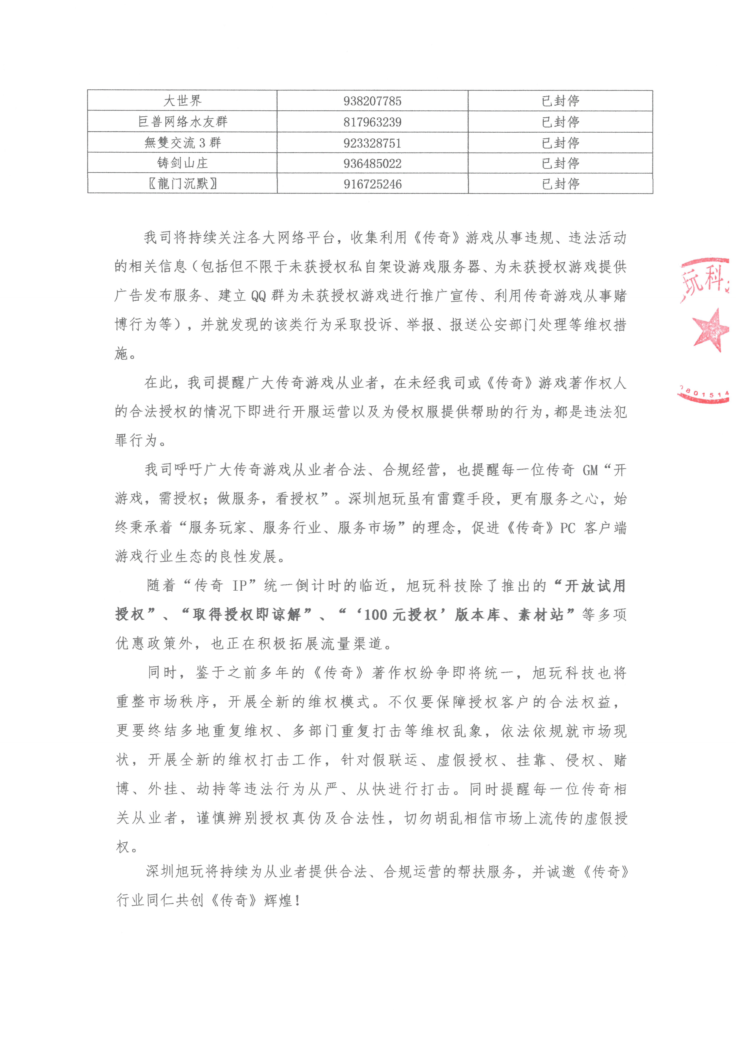 我司將持續關注各大網絡平臺,收集利用《傳奇》游戲從事違規、違法活動的相關信息(包括但不限于未獲授權私自架設游戲服務器、為未獲授權游戲提供廣告發布服務、建立QQ群為未獲授權游戲進行推廣宣傳、利用傳奇游戲從事賭博行為等),并就發現的該類行為采取投訴、舉報、報送公安部門處理等維權措施。