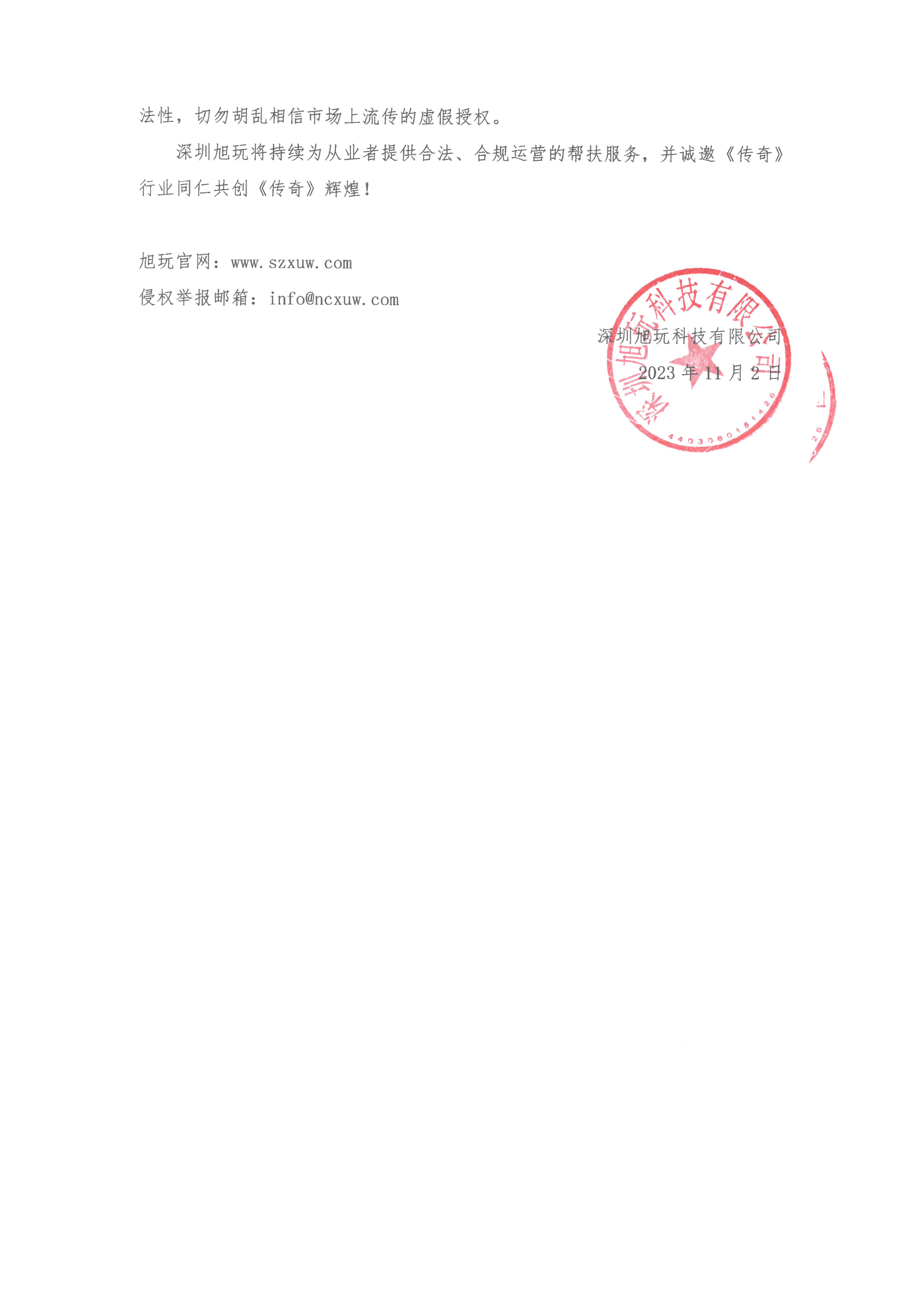 深圳旭玩科技有限公司(以下簡稱“深圳旭玩”)于2023年4月28日依據相關轉授權文件獲得了原始著作權人韓國亞拓士軟件有限公司針對《Legend of Mir II》(中文名:《傳奇》)網絡游戲PC端維權的獨占性權利,以及基于維權目的開發、運營《傳奇》作品PC端非官方版本并進行轉授權、分授權的權利。自獲得授權以來,深圳旭玩積極打擊違法侵權行為,凈化網絡環境,大力推動《傳奇》游戲的合法授權制度,依法維護《傳奇》著作權人的合法權益。