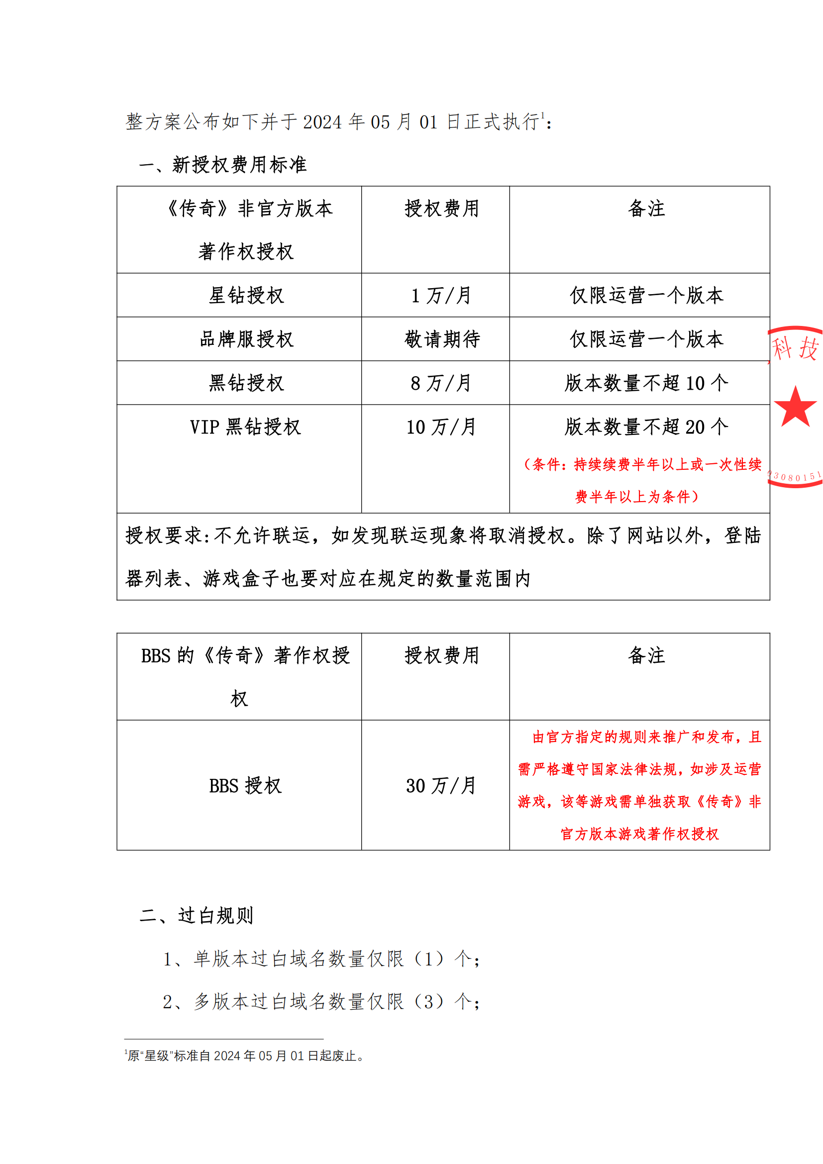 經(jīng)深圳旭玩研究決定統(tǒng)一調(diào)整《傳奇》著作權(quán)授權(quán)費(fèi)用,現(xiàn)將調(diào)整方案公布如下并于2024年05月01日正式執(zhí)行(原“星級(jí)”標(biāo)準(zhǔn)自2024年05月01日起廢止。):