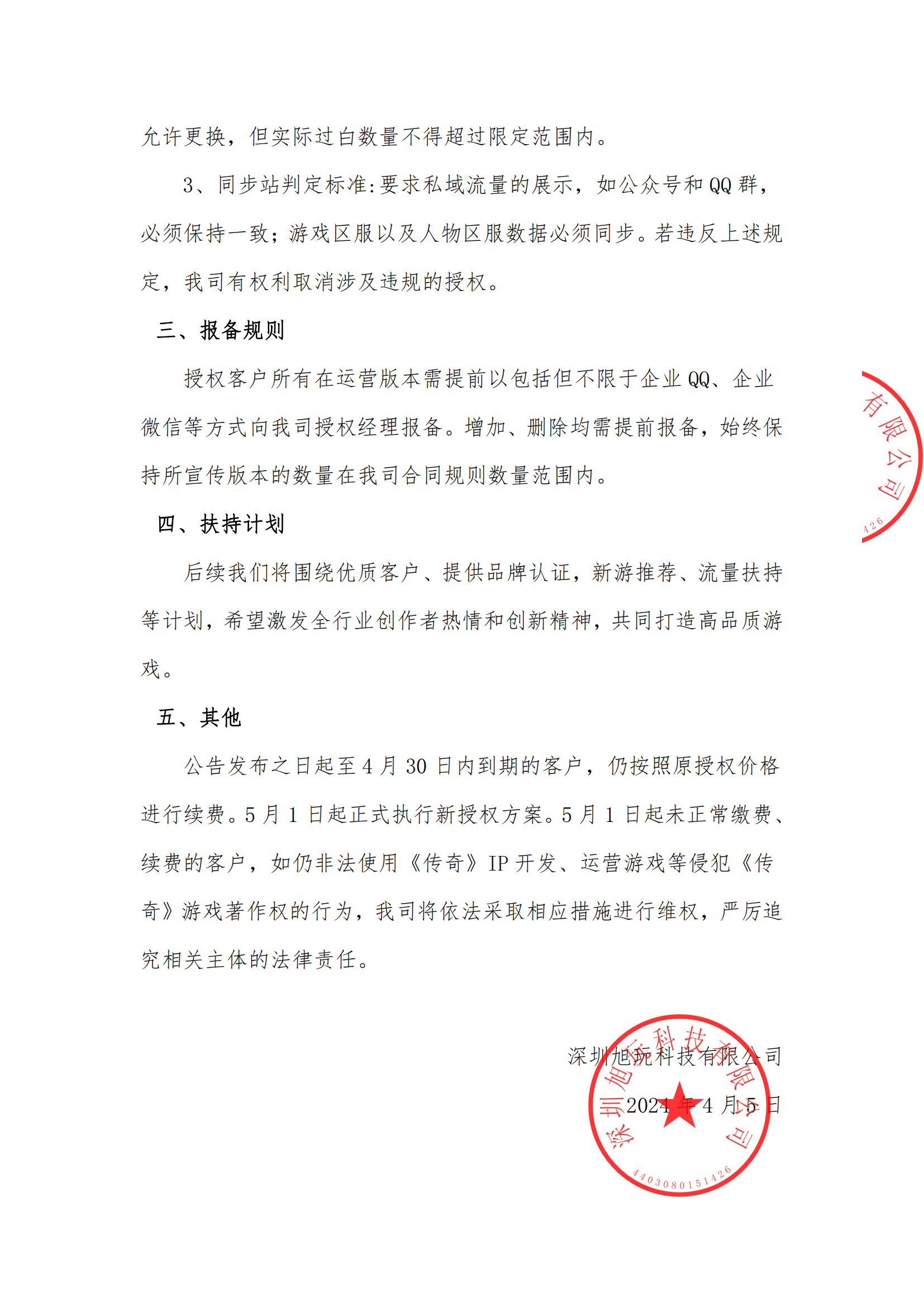 公告發(fā)布之日起至4月30日內(nèi)到期的客戶(hù),仍按照原授權(quán)價(jià)格進(jìn)行續(xù)費(fèi)。5月1日起正式執(zhí)行新授權(quán)方案。5月1日起未正常繳費(fèi)、續(xù)費(fèi)的客戶(hù),如仍非法使用《傳奇》IP開(kāi)發(fā)、運(yùn)營(yíng)游戲等侵犯《傳奇》游戲著作權(quán)的行為,我司將依法采取相應(yīng)措施進(jìn)行維權(quán),嚴(yán)厲追究相關(guān)主體的法律責(zé)任。