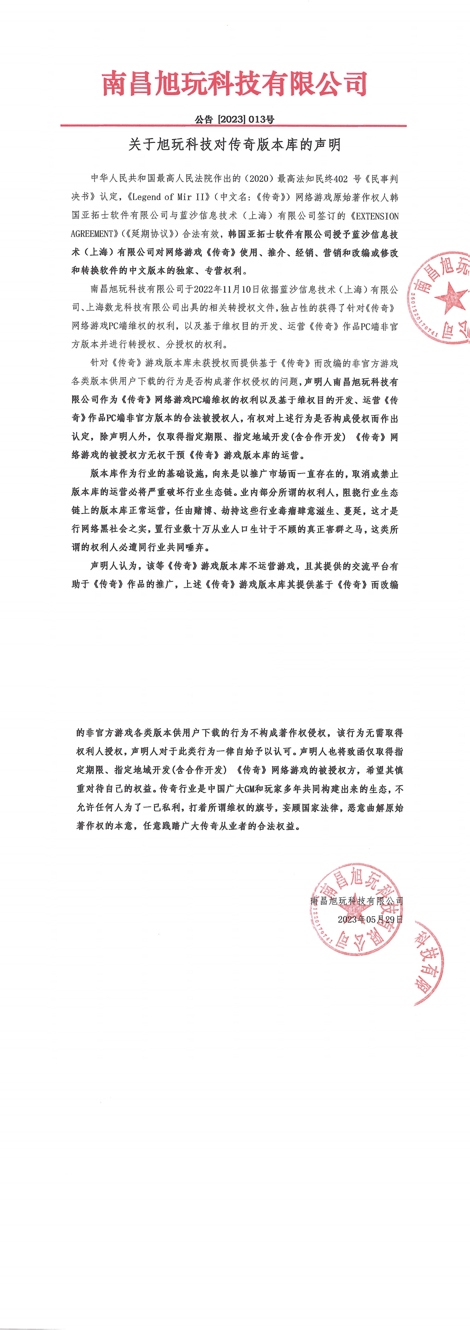 南昌旭玩科技有限公司于2022年11月10日依據藍沙信息技術(上海)有限公司、上海數龍科技有限公司出具的相關轉授權文件,獨占性的獲得了針對《傳奇》網絡游戲PC端維權的權利,以及基于維權目的開發、運營《傳奇》作品PC端非官方版本并進行轉授權、分授權的權利。