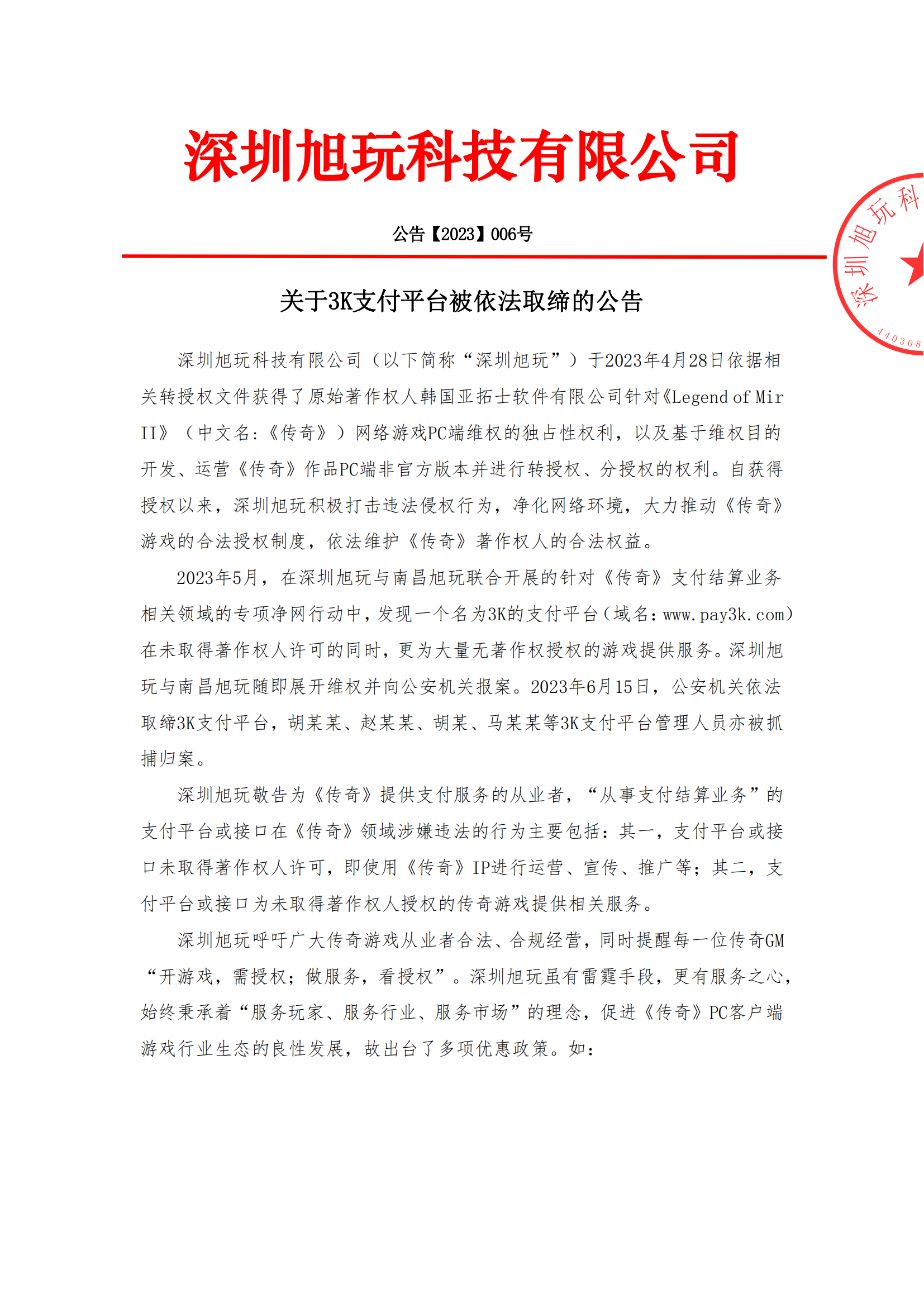 深圳旭玩科技有限公司(以下簡稱“深圳旭玩”)于2023年4月28日依據相關轉授權文件獲得了原始著作權人韓國亞拓士軟件有限公司針對《Legend of Mir II》(中文名:《傳奇》)網絡游戲PC端維權的獨占性權利,以及基于維權目的開發、運營《傳奇》作品PC端非官方版本并進行轉授權、分授權的權利。自獲得授權以來,深圳旭玩積極打擊違法侵權行為,凈化網絡環境,大力推動《傳奇》游戲的合法授權制度,依法維護《傳奇》著作權人的合法權益。