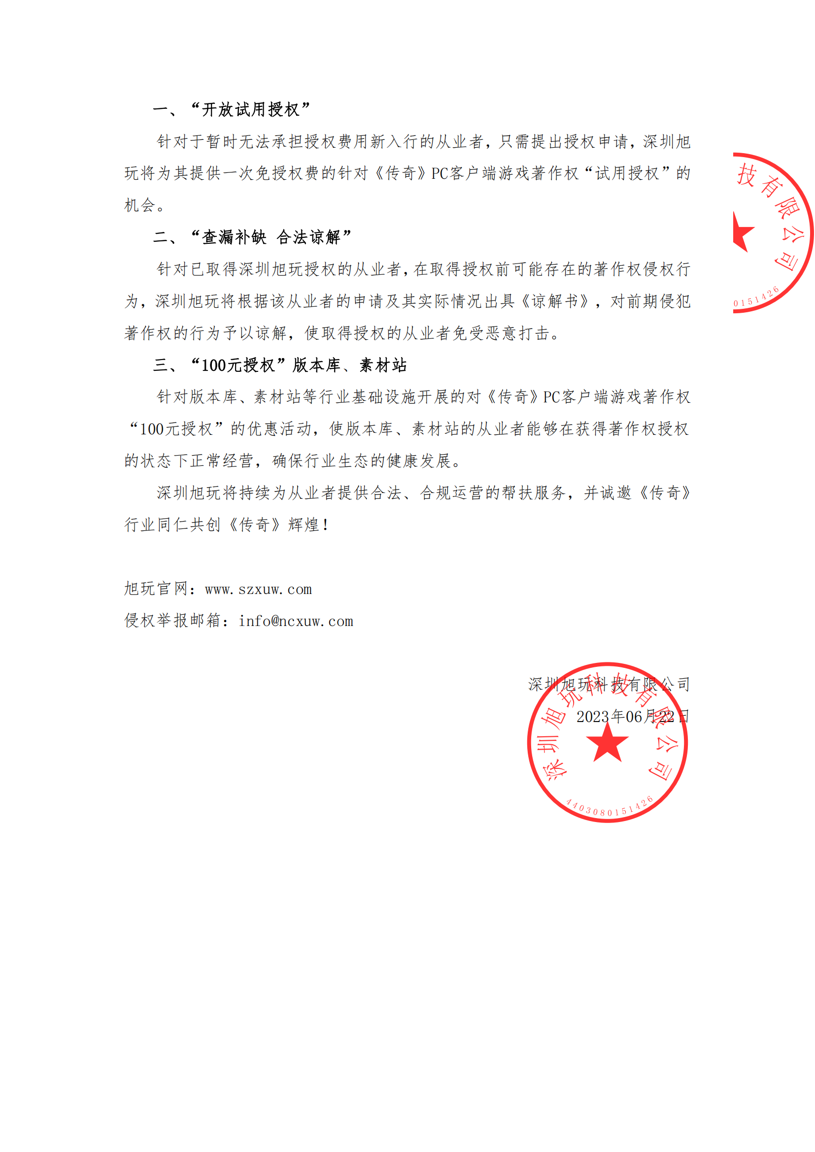 針對版本庫、素材站等行業基礎設施開展的對《傳奇》PC客戶端游戲著作權“100元授權”的優惠活動,使版本庫、素材站的從業者能夠在獲得著作權授權的狀態下正常經營,確保行業生態的健康發展。 深圳旭玩將持續為從業者提供合法、合規運營的幫扶服務,并誠邀《傳奇》行業同仁共創《傳奇》輝煌!