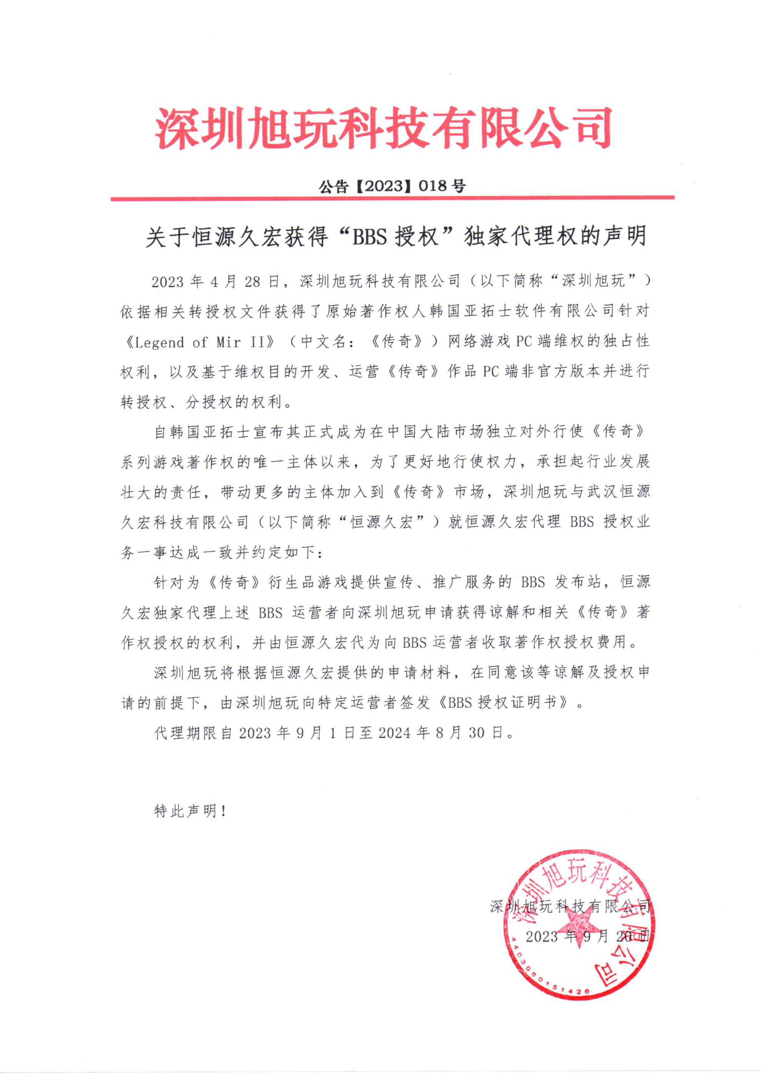 2023年4月28日,深圳旭玩科技有限公司(以下簡稱“深圳旭玩”)依據相關轉授權文件獲得了原始著作權人韓國亞拓士軟件有限公司針對《Legend of Mir II》(中文名:《傳奇》)網絡游戲PC端維權的獨占性權利,以及基于維權目的開發、運營《傳奇》作品PC端非官方版本并進行轉授權、分授權的權利。